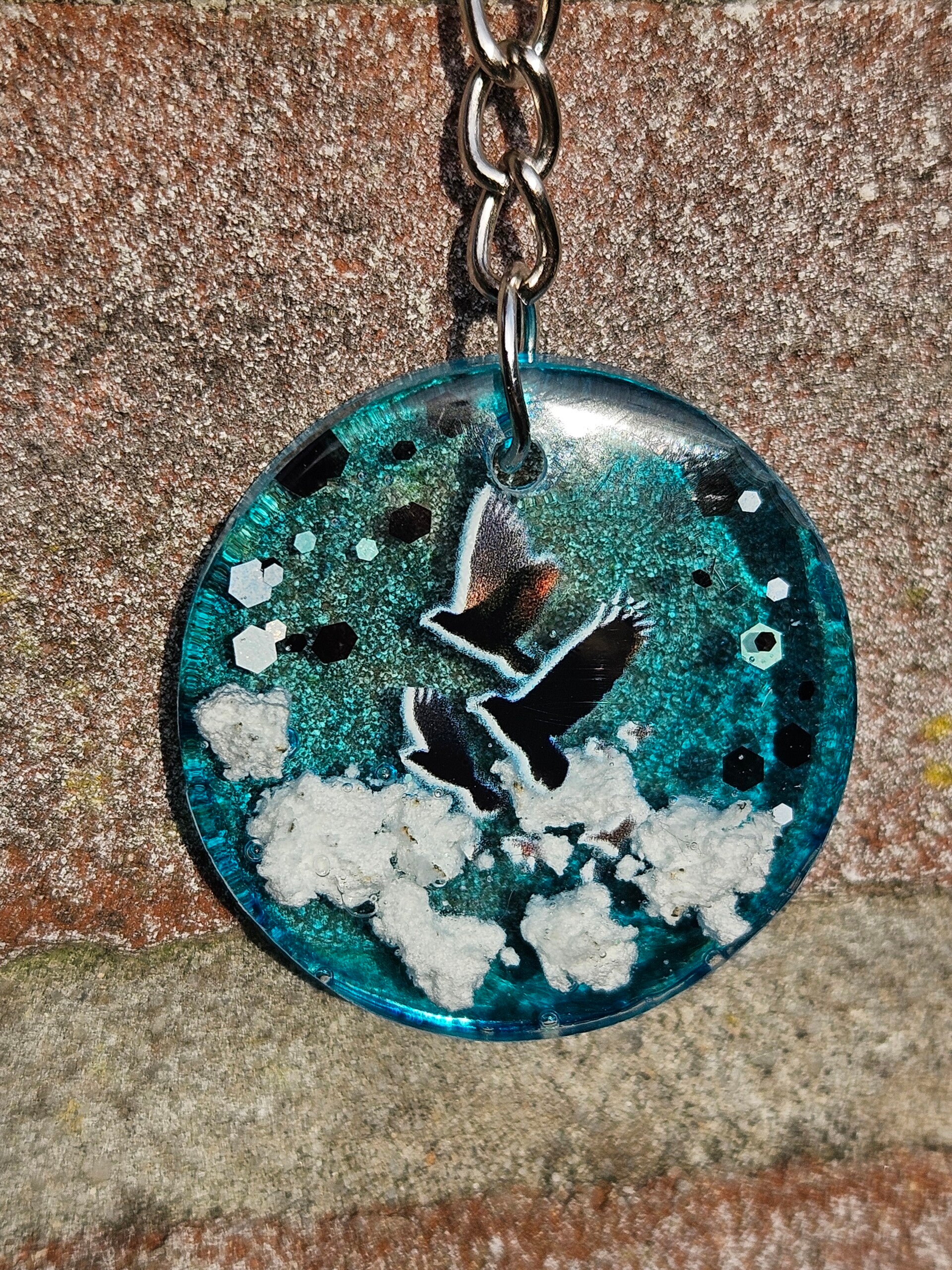 Deze handgemaakte sleutelhanger is als een klein stukje hemel dat je overal mee naartoe neemt. Binnenin bevindt zich een betoverend 3D-tafereeltje met wolkjes en vogeltjes – alsof je even omhoog kijkt naar een vredige lucht. ✨