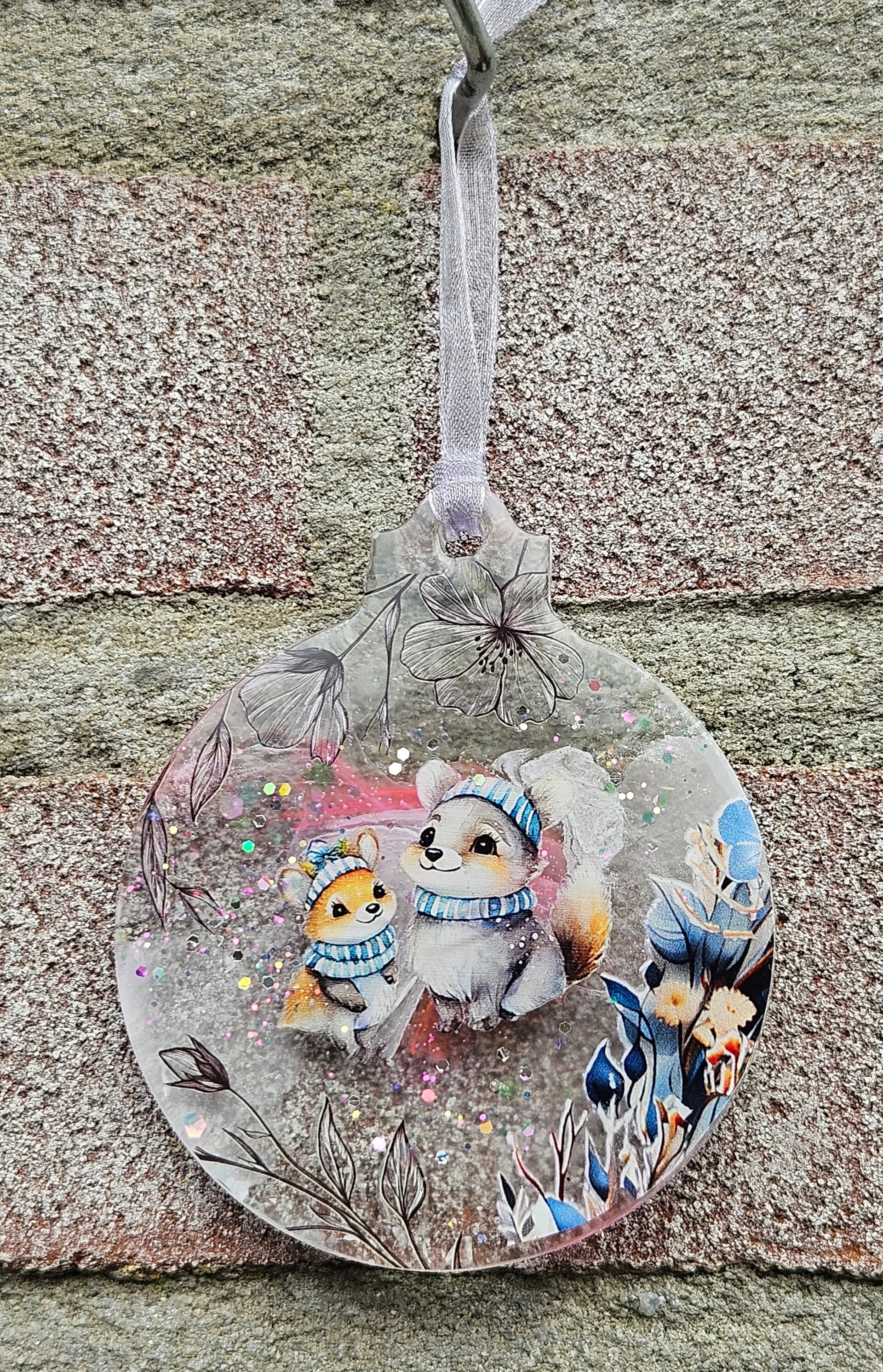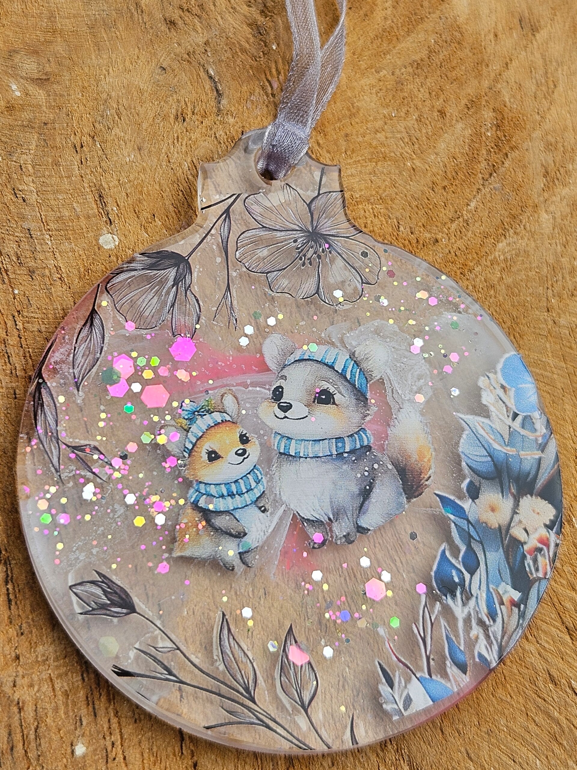 Hanger "Kerstbal" Eekhoorntjes Transparant glitter
