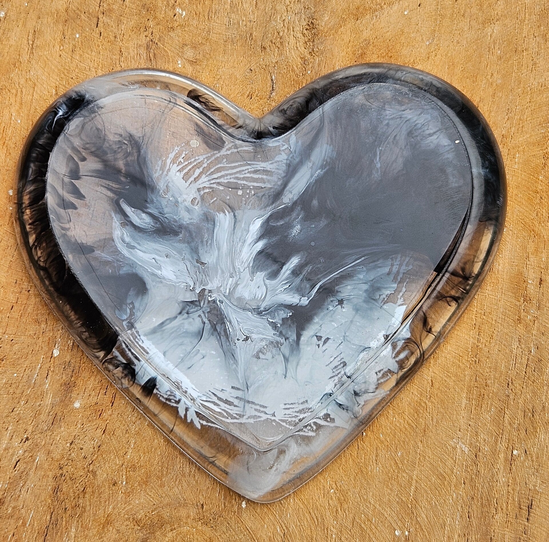 Dit handgemaakte epoxy bakje in de vorm van een hartje is een echte blikvanger. Met zijn afmetingen van 12 cm lang, 11 cm breed en 1 cm hoog is het perfect als sierlijk schaaltje voor sieraden, sleutels, zeepjes of gewoon als decoratief accent.